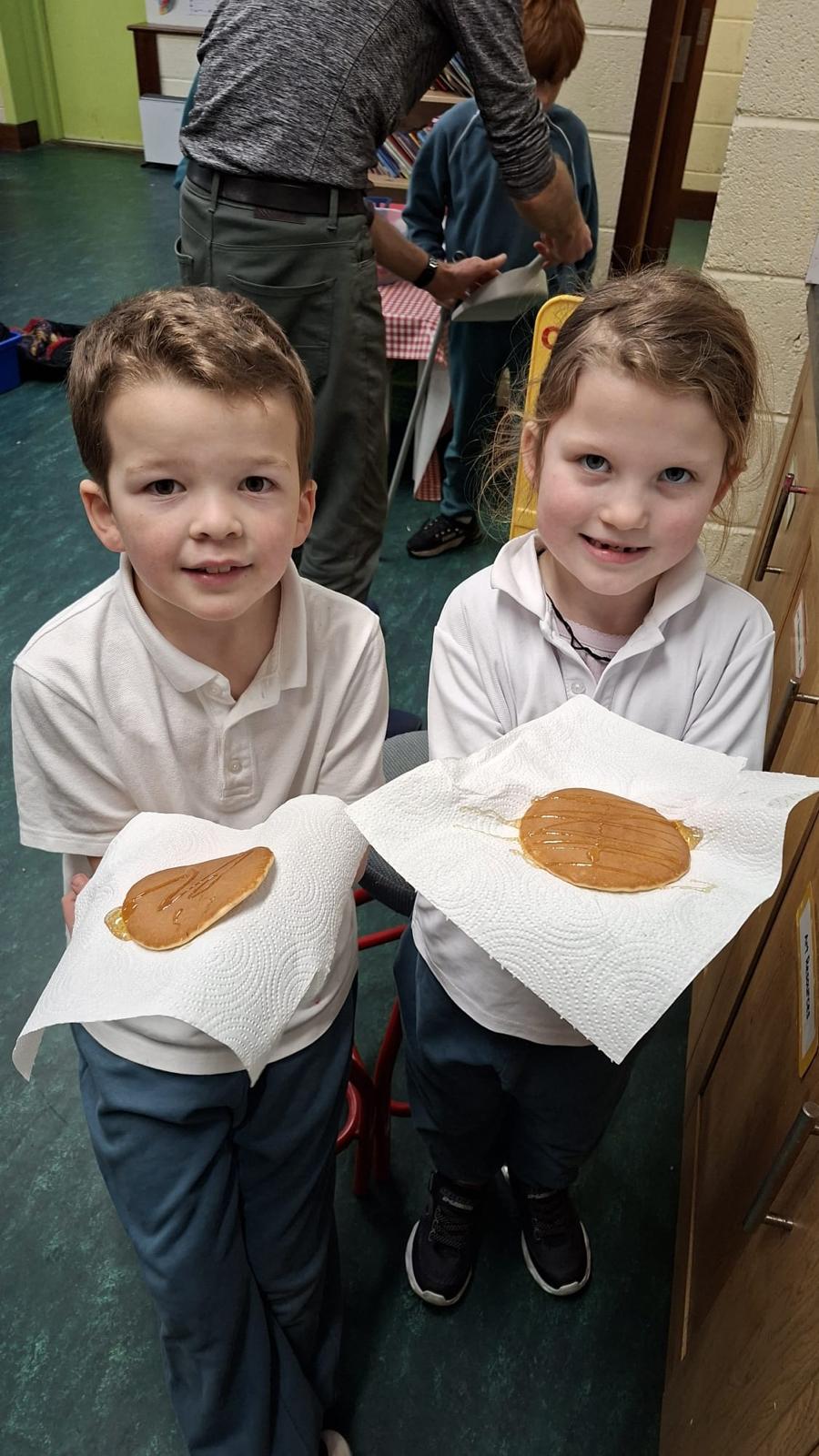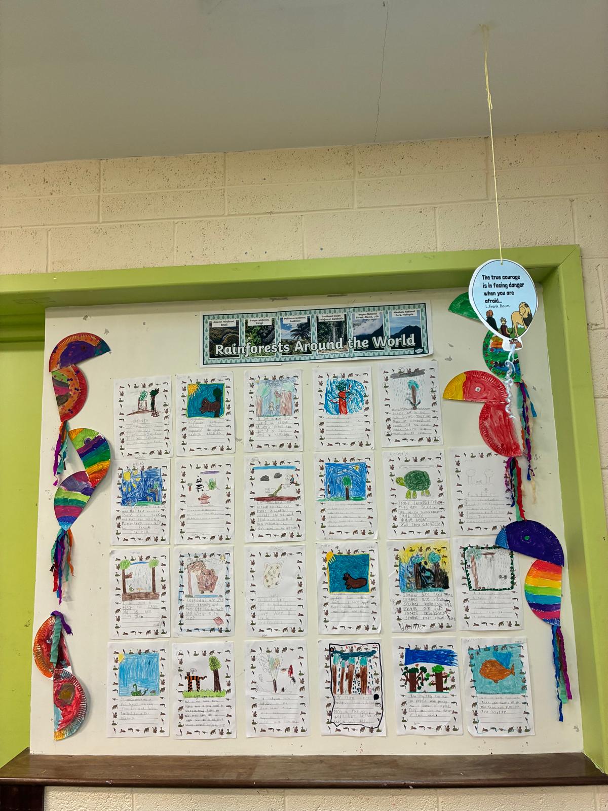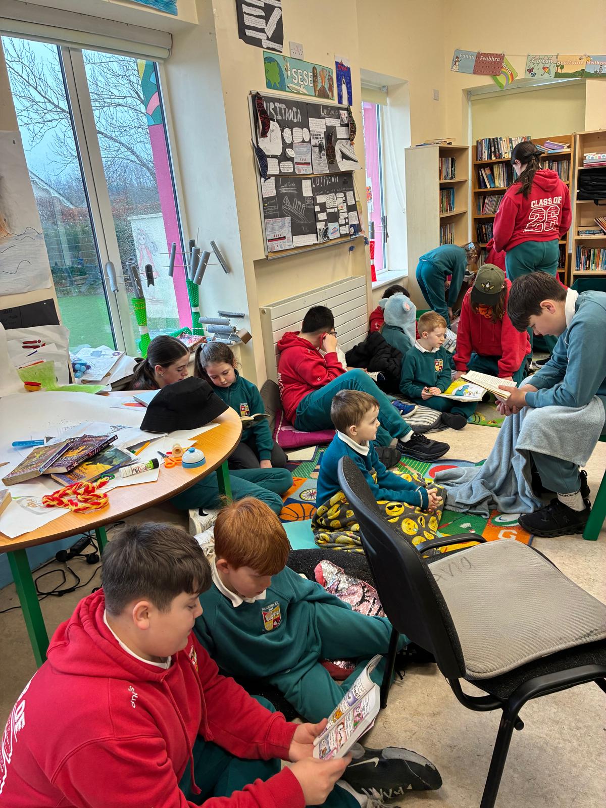 First class have had great fun the last few weeks. We made Bridget’s crosses and enjoyed pancake day. We were also learning about the rainforest for Green Schools and made beautiful parrots, chameleons and did creative writing. We had a visit from Sringfield Ramblers one day and have been doing shared reading with sixth class.
